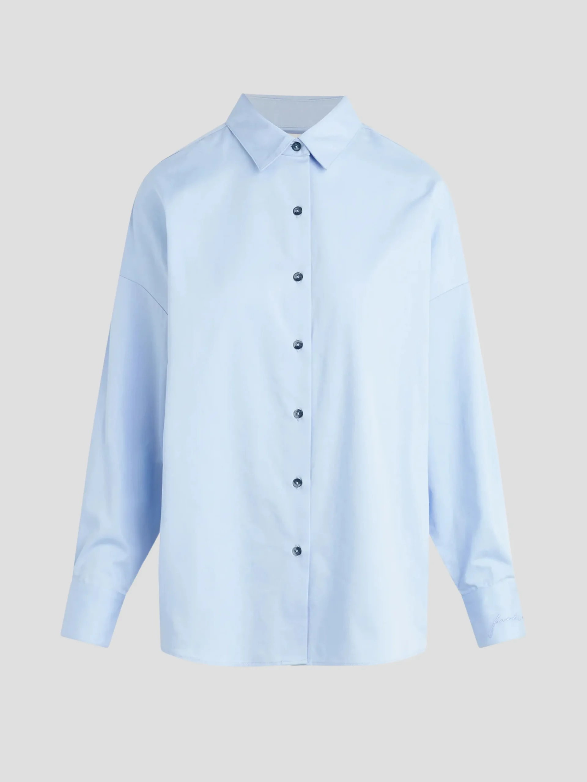 Take your wardrobe to the next level with The Ex Boyfriend Shirt in Blue from Favorite Daughter. Featuring a relaxed fit and pointed collar, this oversized button up is made of a soft cotton satin and boasts our signature embroidery on the sleeve cuff. Whether you prefer it tied, tucked, half-tucked, or unbuttoned, this versatile Powder Blue shirt is a must-have for any fashion lover.